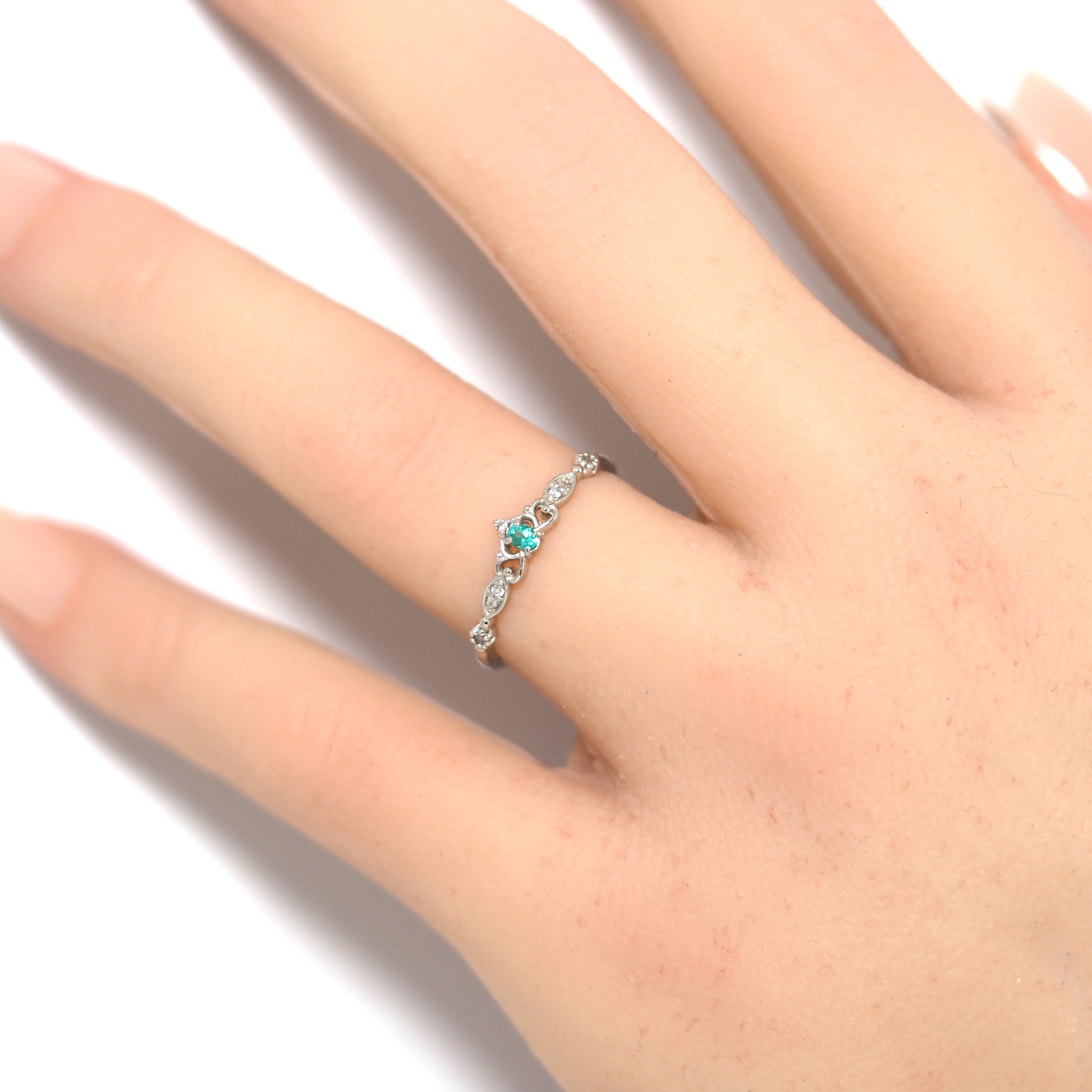 今回ご紹介する商品はpt900のパライバトルマリンのリングです。小粒ながらも存在感のあるパライバトルマリンを使用し、ダイヤは0.04ctあります