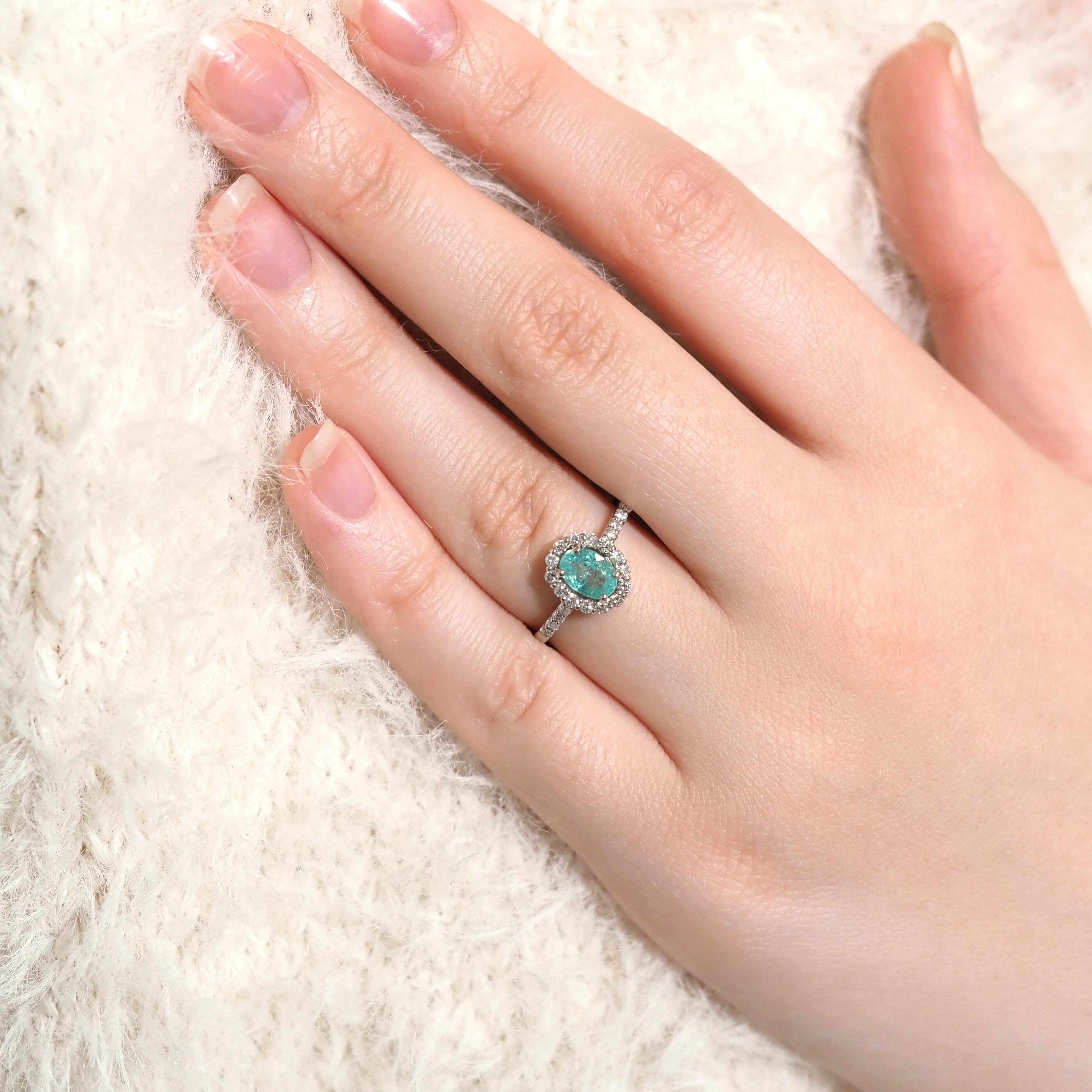 透明感あふれるブルーグリーンが美しく煌めく、パライバトルマリンのリングです。0.57ctの大粒なパライバトルマリンは、陽の光を受けるたびにキラキラと輝き、その存在感を際立たせます。取り巻きのダイヤモンドはトータル0.28ctで華やかさの中にも上品な印象を添えています。
